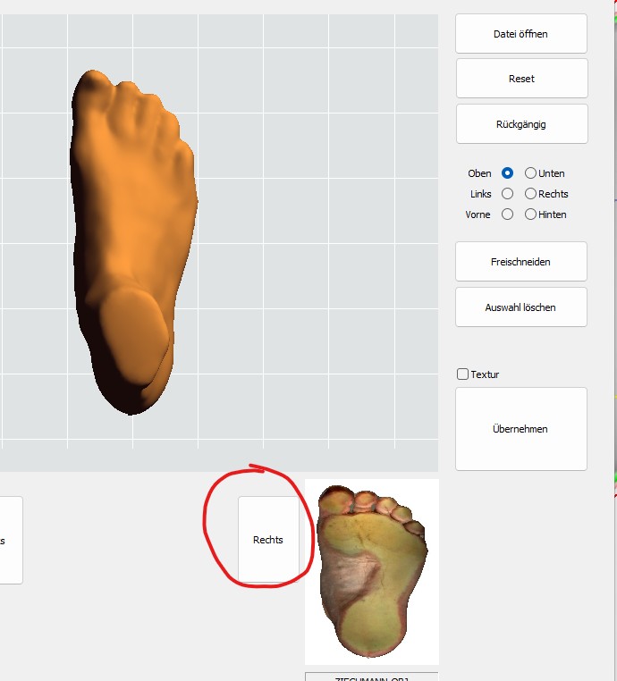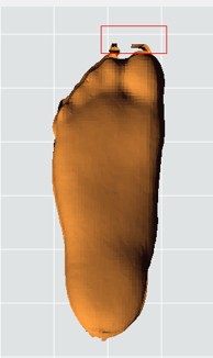 The software can be used to import completely 3D scanned feet, including the leg, footbeds and plantar soles. It is also suitable for importing the tops of insoles. To do this, the individual surface of the upper must be imported (not a closed solid or 2 surfaces).